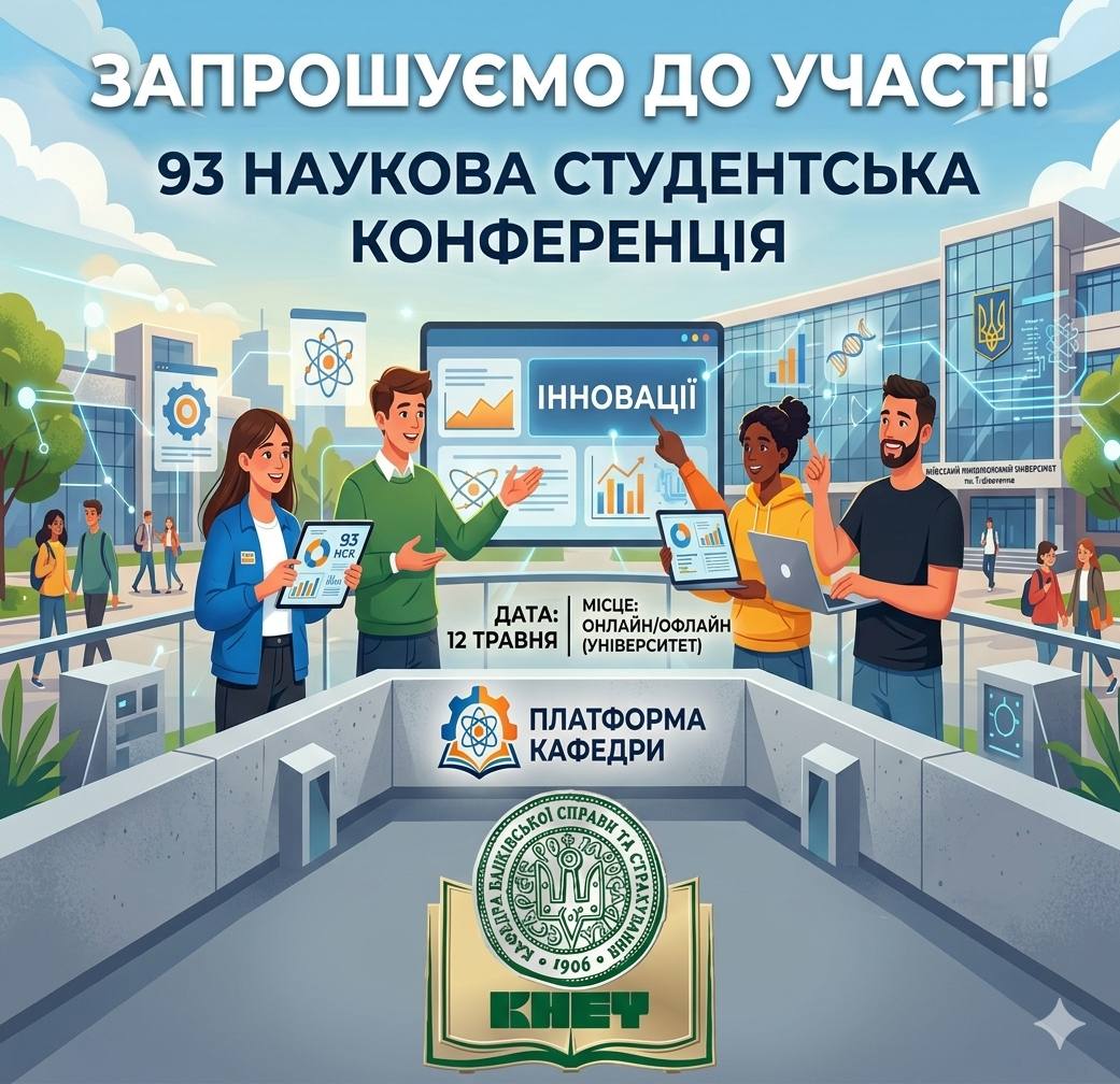 12 травня відбудеься чергова наукова студентська конференція21 Квітня 2026р.![]() Згідно наказу від 12.03.2026 р. №59-ос, відбудеться робота 93-ї щорічної студентської наукової конференції КНЕУ «Інноваційні проєктні рішення на шляху до економічного відродження України». Робота конференції по платформі кафедри банківської справи та страхування "Банківський та страховий бізнес на шляху до економічного відродження України" відбудеться в змішаному режимі (в аудиторії 049 3 корпусу КНЕУ та на платформі ZOOM). У ході попередньої підготовки, що тривала з середини березня, 16 науковими керівниками заявлено 10 доповідей та публікація 51 тез студентами ОПП бакалаврського («Банківський бізнес», «Управління фінансовим бізнесом») та магістерського («Банківський бізнес та фінансова аналітика» , «Страховий бізнес» , «Ризик-менеджмент фінансового бізнесу» , «Державні фінанси і митна справа», «Міжнародні фінанси») рівнів. Голова наукового комітету конференції – зав. каф. банківської справи та страхування КНЕУ, д.е.н., проф. Примостка Л.О. Заступник Голови наукового комітету конференції – д.е.н., проф. Краснова І.В. Модератор – к.е.н., доц., проф. кафедри Нікітін А.В. Член наук комітету – к.е.н., доц., проф. кафедри Білошапка В.С. Програма пленарного засідання із планом проведення і переліком учасників – за покликанням. Просимо учасників надіслати науковим керівникам тези за встановленою формою (див зразок) – не пізніше 9 травня 2026 р. Запрошуємо учасників і всіх бажаючих приєднатись до пленарного засідання! За результатами проведення конференції звіт із презентаціями учасників буде опубліковано на сайті кафедри |
