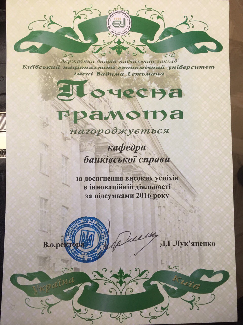 17.05.2017 декан фінансово-економічного факультету, к.е.н., проф. Хлівний В.К. нагородив Почесною грамотою колектив кафедри банківської справи за значні досягнення в інноваційній діяльності колективу кафедри в 2016. Нагадємо, що згідно квітневого наказу,про рейтинг по інноваційній діяльності, колектив кафедри банківської справи посів 10 місце з 54 кафедр вузу.