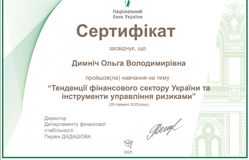 29 травня 2025 року к.е.н., доцент кафедри банківської справи та страхування Димніч Ольга Володимирівна взяла участь у навчальному семінарі Національного банку України на тему «Тенденції фінансового сектору України та інструменти для управління