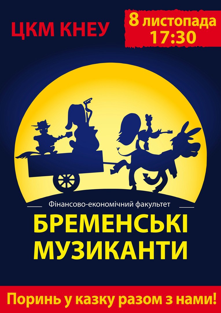 8 листопада 2016р. в межах щорічного балу першокурсників "Осіння казка" відбулася прем'єра "Бременських музикантів". У постановці взяли участь студенти 1 групи 1 курсу ФЕФ (куратор доцент Білошапка В.С.) - Таня Терлецька, Тарас Глушенков, Олена Мазур, Катя Дацишена, Вероніка Чернецька, Настя Крижна, Катя Лемешова. Вітаємо з вдалою прем'єрою й чекаємо результатів міжфакультетського голосування!