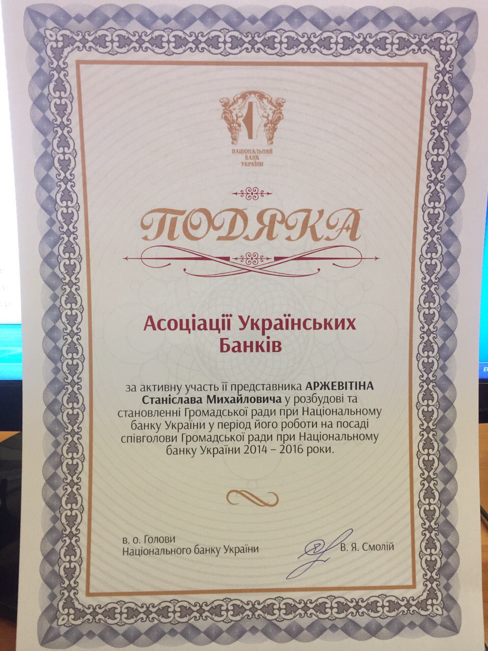 Завідувачу кафедри банківської справи Аржевітіну Станіславу Михайловичу було вручено подяку за активну участь у розбудові та становлені Громадської ради при Національному банку України.