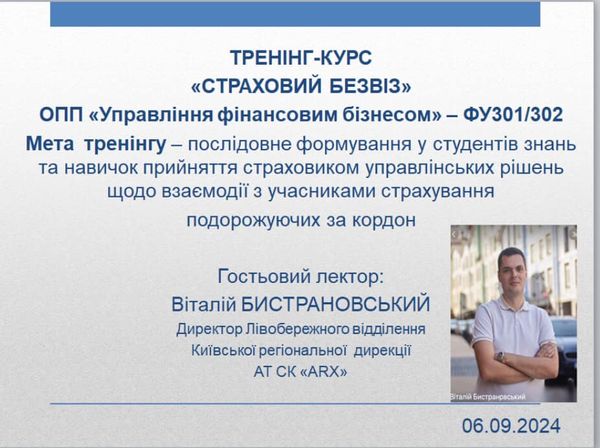 Гостьовий лектор на тренінг-курсі «Страховий безвіз»06 Вересня 2024р.Розуміння правил безвізового режиму та основ страхування є важливою частиною підготовки фахівців економічних спеціальностей. До виїзду за кордон з різних причин потрібно готуватися: визначитися, який саме страховий захист потрібен, проаналізувати різні пропозиції страхових компаній та обрати те, що для нас найкраще! Підготувавши для студентів ФУ 301/302 тренінг-курс «Страховий безвіз» ми запросили гостьового лектора: Директора Лівобережного відділення Київської регіональної дирекції АТ СК «ARX», у минулому нашого студента - Віталія БИСТРАНОВСЬКОГО, який розповів, що таке Зелена картка та які її особливості, як правильно обрати страхову компанію і купити такий поліс; який алгоритм дій слід застосувати, щоб убезпечити себе від зайвих неприємностей. Віталій БИСТРАНОВСЬКИЙ, акцентував увагу і на особливості медичного асистансу (подорожуючих за кордон, відрядження чи навчання) на території покриття ризиків; наголосив, що СК надає послуги, приймає рішення, а організовує допомогу асистуюча компанія за кордоном. Головною тезою було: «памʼятати, страховий поліс (захист) ми купуємо не для поліцейського і таможні, а для СЕБЕ» і ми з цим погоджуємося  Навіть жартували, бо наші студенти, які навчаються за обміном за кордоном почали перевіряти дію своїх страхових полісів, адже в теперішніх умовах його дія 29 днів, а потім його потрібно пролонгувати. Дякуємо, Віталію БИСТРАНОВСЬКОМУ за час  який він приділив для нас, за актуальну, насичену практичними кейсами лекцію! Було дуже цікаво  До нових зустрічей! |