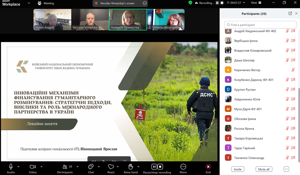 Відбулась чергова гостьова лекція на ОП «Банківський менеджмент»05 Травня 2025р.![]() 5 травня 2025 р. на кафедрі банківської справи та страхування КНЕУ, в рамках викладання дисципліни «Інновації у банківському бізнесі» (магістерська ОПП «Банківський менеджмент», керівник курсу проф. Андрій НІКІТІН) - на платформі Zoom відбулась гостьова лекція Керівника проєктів і програм Фонду розвитку інновацій Міністерства цифрової трансформації України, аспіранта кафедри Ярослава ВІННИЦЬКОГО (наук. керівник - д.е.н., проф., зав. кафедрою Людмила ПРИМОСТКА). Тема лекції: «Інноваційні механізми фінансування гуманітарного розмінування: стратегічні підходи, виклики та роль міжнародного партнерства в Україні» Зустріч пройшла в доброзичливій робочій обстановці. Зрозуміло, що в сучасних умовах питання фінансового забезпечення розмінування в Україні є надзвичайно актуальним. Були розглянути питання змісту та джерел гуманітарного розмінування, інноваційних фінансових механізмів гуманітарного розмінування, в тому числі цифрові рішення у фінансуванні розмінування. Особливу увагу приділено питанням розвитку нормативно-правової бази гуманітарного розмінування в Україні, перспективам міжнародного партнерства у даній сфері. Серед слухачів були викладачі кафедри, здобувачі ОПП «Банківський менеджмент», здобувачі бакалаврського рівня ОП «Банківський бізнес», «Управління фінансовим бізнесом». Після лекції відбулось жваве обговорення та надані відповіді на питання. Дякуємо всім учасникам за активність! Презентація лекції за посиланням. Відеозапис зустрічі розміщений на каналі кафедри в YouTube - посилання |