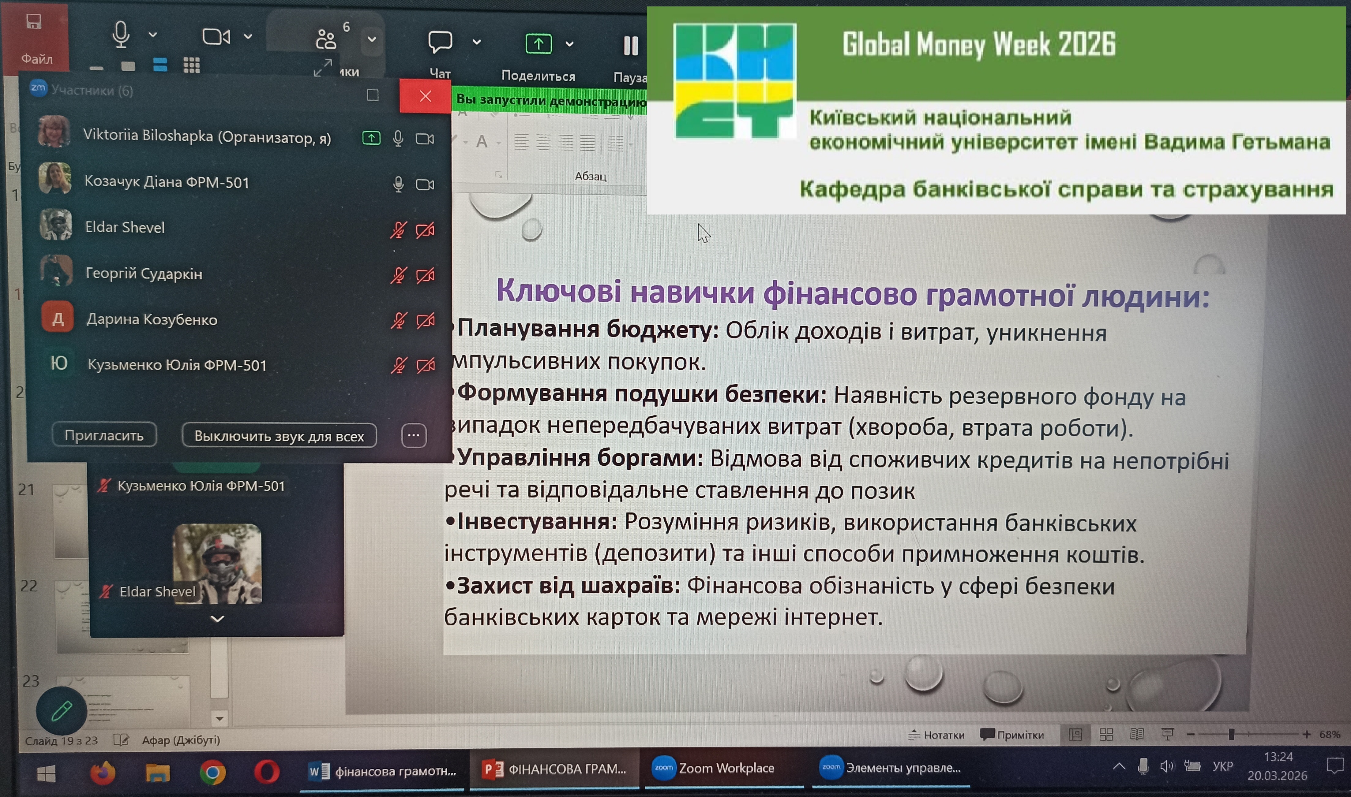 20 березня 2026р. у межах щорічної міжнародної кампанії — Всесвітнього тижня грошей (Global Money Week 2026) — професоркою кафедри банківської справи та страхування, канд.екон.наук, доцентом Білошапкою В.С. для здобувачів Освітньої магістерської програми «Ризик-менеджмент фінансового бізнесу» (другий (магістерський) рівень вищої освіти) було проведено семінар-бесіду з питань фінансової грамотності. Здобувачі в ході жвавого фахового обговорення шукали відповіді на питання «Як не потрапити в пастку фінансових маніпуляцій та навчитись приймати розумні рішення щодо своїх грошей?». Формою контролю знань наприкінці семінару було бліц-тестування з проблематики практичних фінансових навичок.