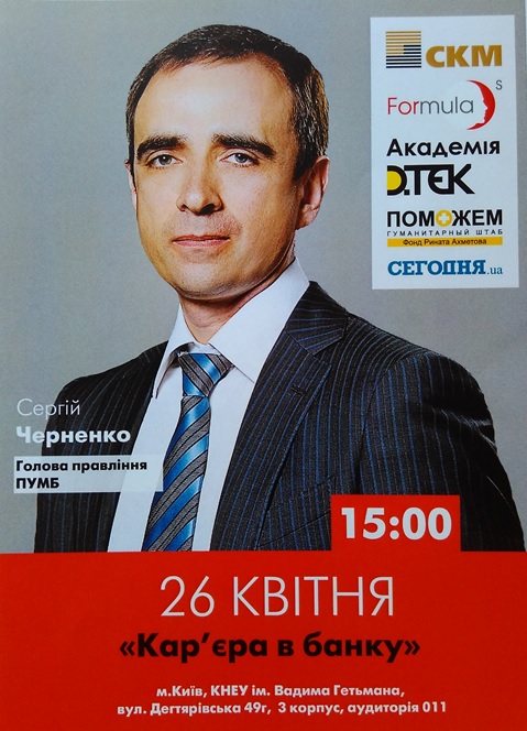 26 квітня 2016 р. у ДВНЗ «Київський національний економічний університет імені Вадима Гетьмана» відбулась відкрита лекція Сергія Черненка, голови правління «Першого Українського Міжнародного Банку» на тему «Кар’эра в банку»28 Квітня 2016р.