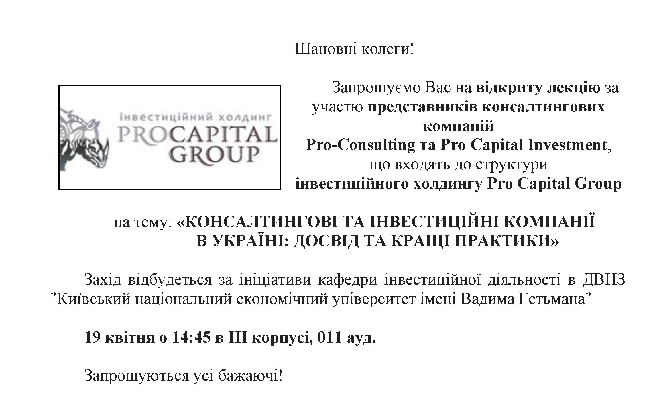 Запрошуємо Вас на відкриту лекцію за участю представників консалтингових компаній Pro-Consulting та Pro Capital Investment, що входять до структури інвестиційного холдингу Pro Capital Group