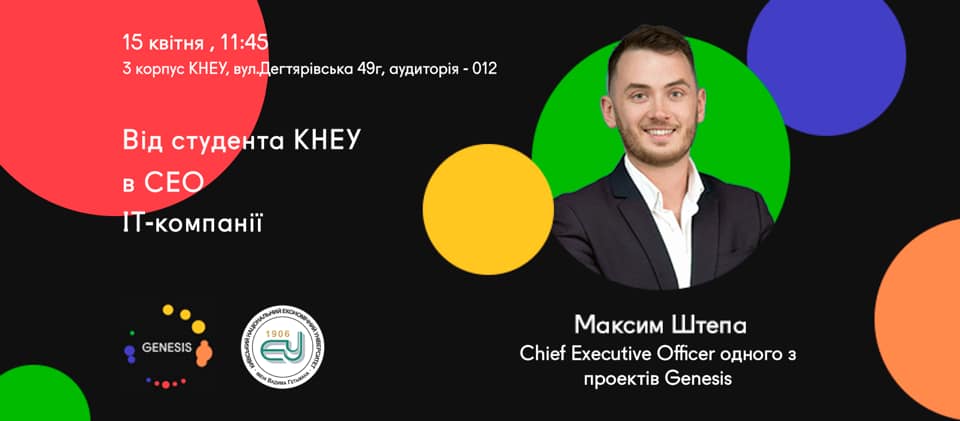 Спікер - Максим Штепа, випускник КНЕУ, один з партнерів Genesis і виконавчий директор одного з проектів Genesis. Максим розповість про свій шлях з фінансів в IT, адже сам пропрацював 5 років в інвестбутиках і корпоративних фінансах.