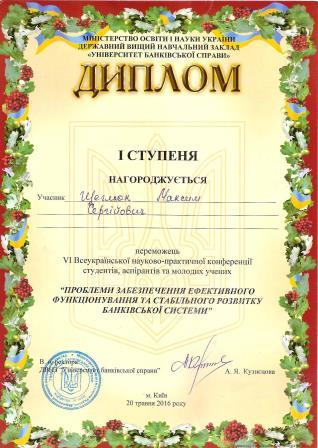 - Вітаємо Щеглюка М.С. з перемогою у Всеукраїнській науково-практичній конференції «Проблеми забезпечення ефективного функціонування та стабільного розвитку банківської системи»
